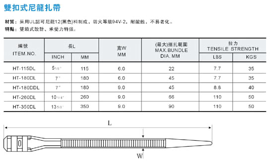 材料:該產品采用PA66原料制作,且該材料通過美國UL認可,防火等級為9V-2、耐酸、耐蝕、阻燃、絕緣性能良好不易老化、自鎖式設計承受力特強。我們專注尼龍扎帶的生產研發,我司生產的尼龍扎帶均符合歐盟ROHS認可,質量性能由ISO9001國際質量體系控制,產品的結構的設計均符合市場的要求。